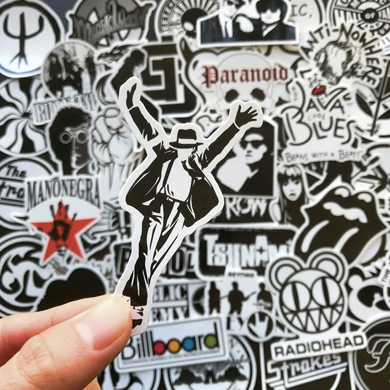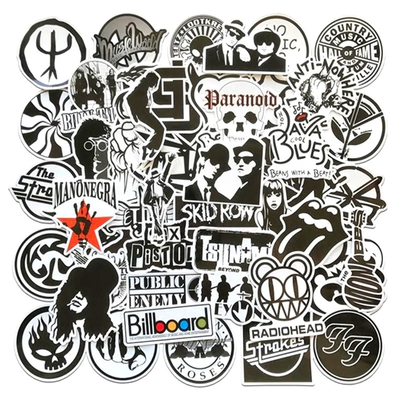 Le kit comprend 50 autocollants avec des dimensions de 6 à 10 cm, représentant des artistes comme Mickael Jackson, sexe pistol, Manonegra, Rod Stewart, Blues Brothers, Public Enemy, les Stones, Beyond, Elvis Presley, Paranoid, Radiohead, The Strokes, Guns n’Roses et des autres artistes mondiaux ainsi que des logos de maison de disque et radio représentatifs de la musique internationale.