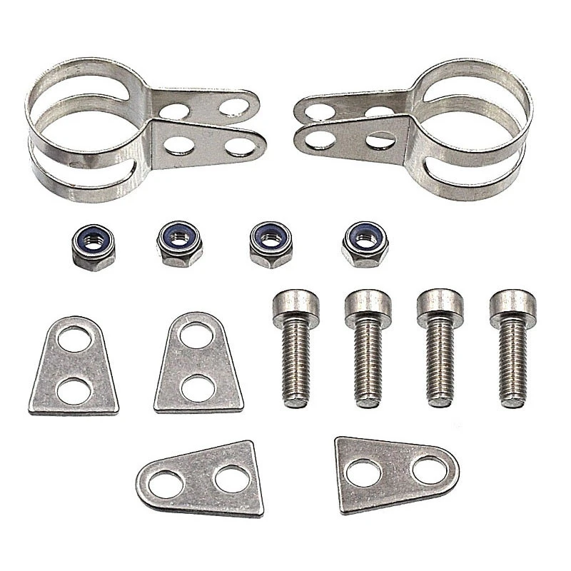 L’ensemble est livré complet avec 2 colliers en acier inoxydabke, 4 pattes de fixation, 4 boulons et 4 écrous nylstop.