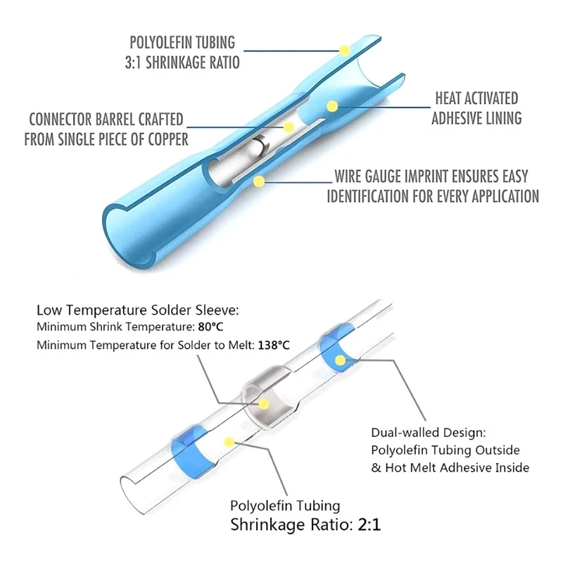 Le tube imperméable polyoléfine présent à l’extérieur et l’adhésif thermofusible à l’intérieur fournit une excellente propriété imperméable lors des raccords électriques dans le domaine du vélo et pour le branchement des fils électriques sur VAE et pour le raccordement des dynamos.