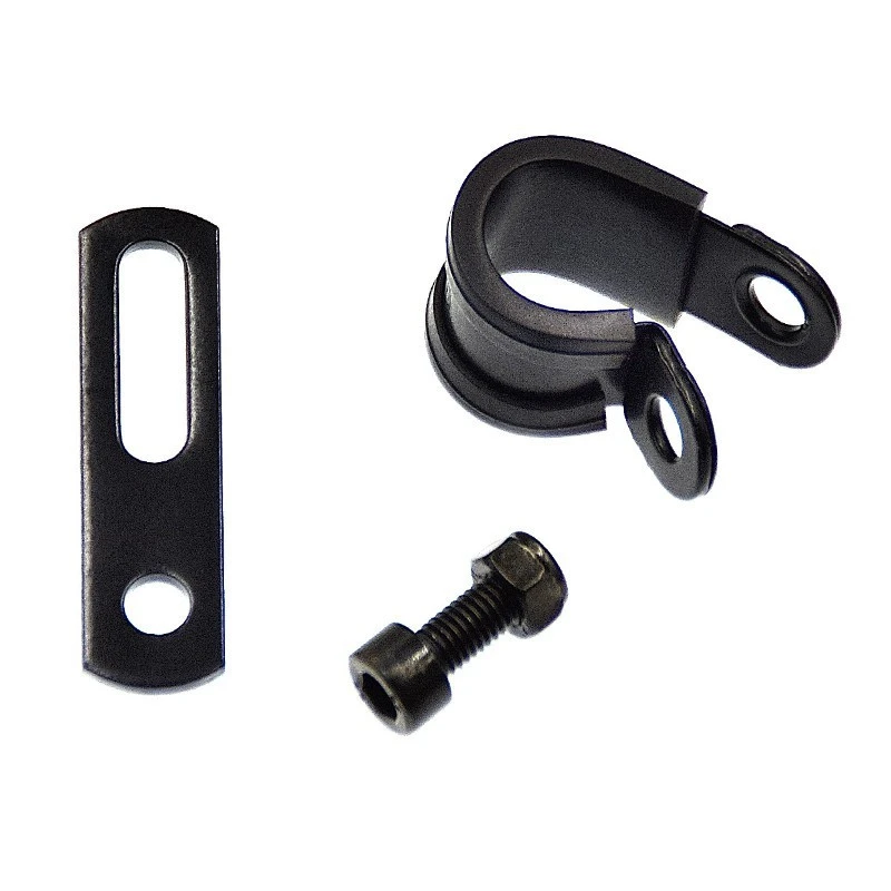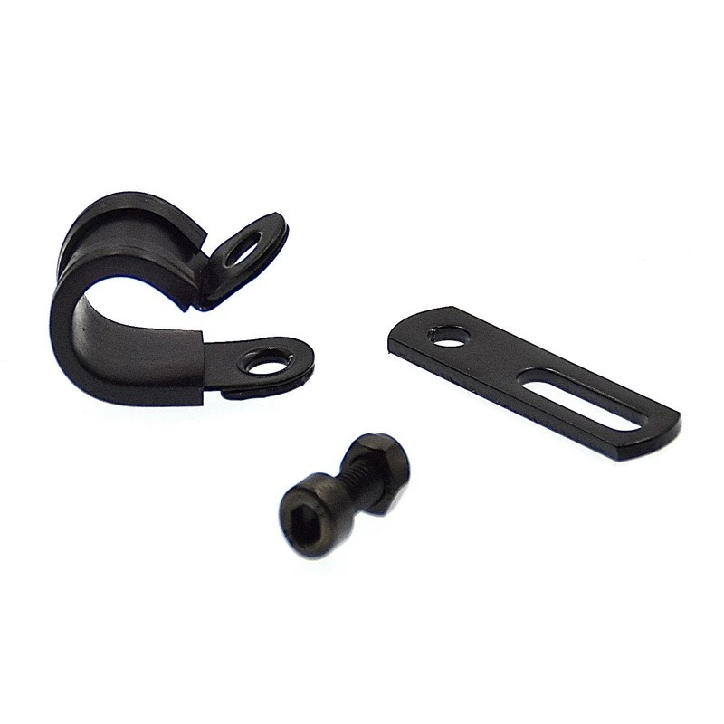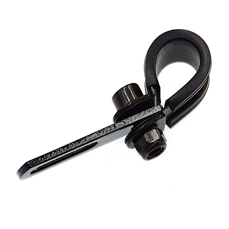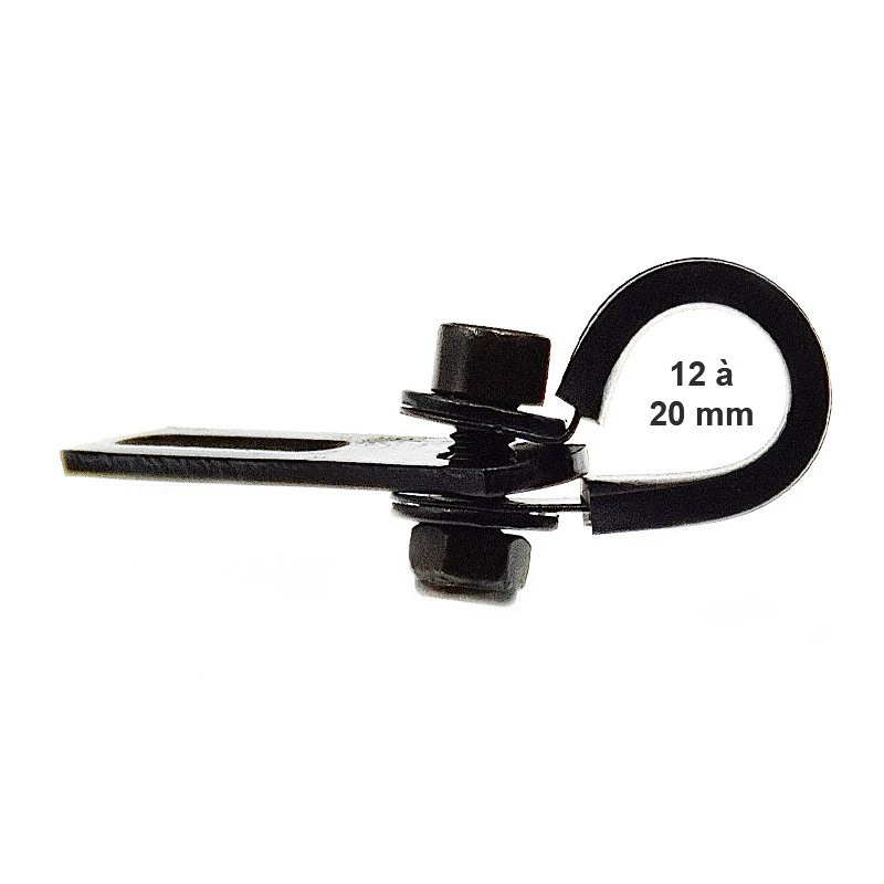 Ce collier en acier zingué recouvert de caoutchouc est très pratique pour fixer un porte bagage arrière sur les haubans du vélo sans abîmé la peinture.