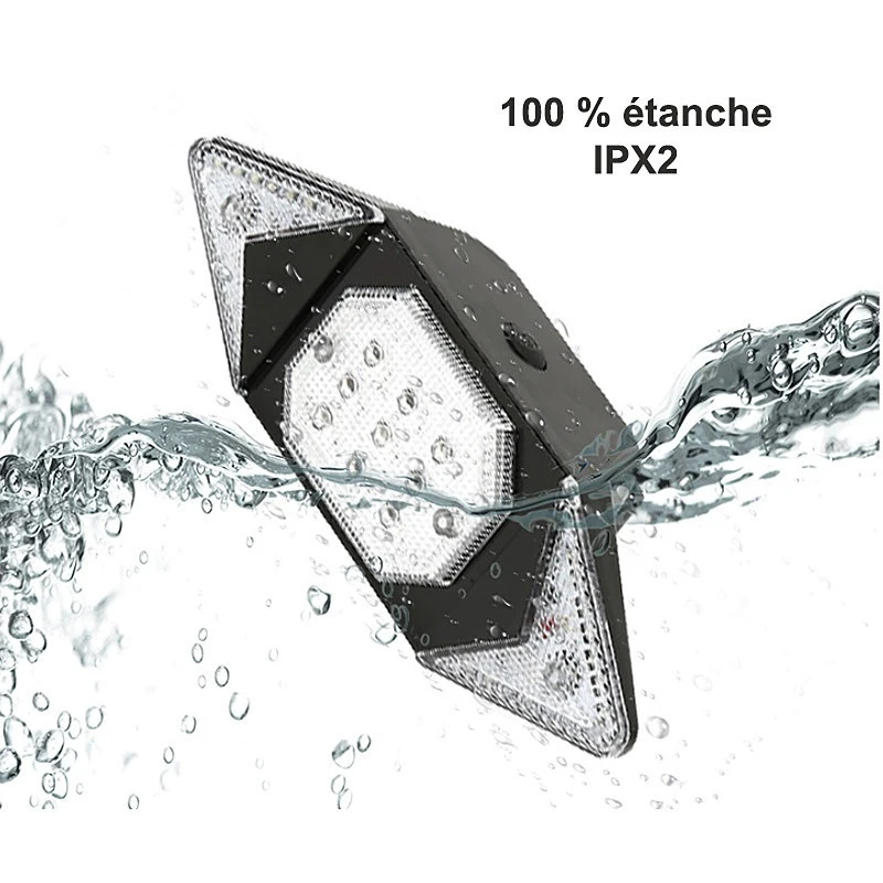- Modes d’éclairages : Clignotant droit et gauche, feu stop rouge, feu stop flash bleu et rouge.
