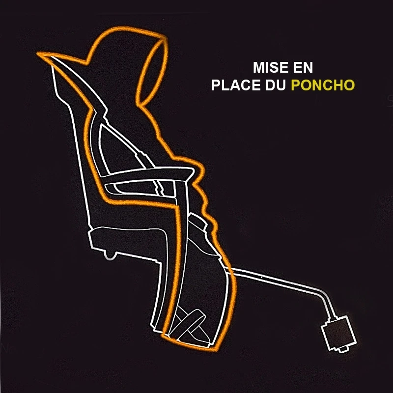Le poncho enveloppe le siège d’enfants pour bicyclette et dispose d’une grande cape, laissant assez d’espace pour le casque.