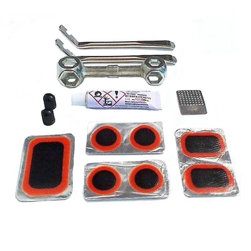 Ce kit de réparation pour crevaison est constitué d’un tube de colle 10 cc, 1 clé multi 10 trous, 2 démontes pneu , 1 râpe, 2 bouchons de valve, 1 rustine de 52 x 34 mm, 2 rustines de 35 x 24 mm, 4 rustines rondes de 25 mm de diamètre.