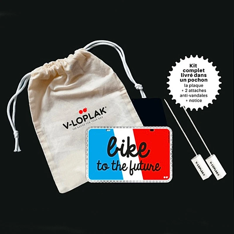 La plaque Bike to the Future tricolore se positionne facilement sous la selle grâce aux 2 attaches anti-vandales. Cet accessoire original de fabrication Française est rétro-réfléchissant et et colorée en bleu-blanc-rouge.