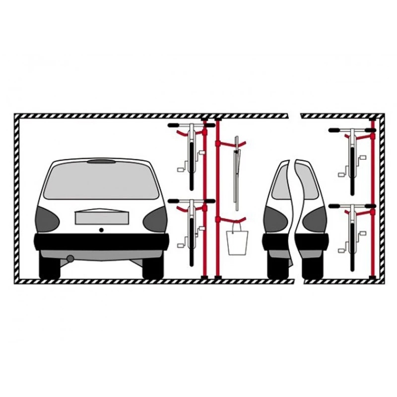 Rangement universel pour 2 vélos. Fixation sans perçage. Télescopique de 2 à 2,75 m. Position des «bras» réglable en hauteur. Peut être installé au milieu d’une pièce. Armature tube acier carré 25 et 20 mm. Manchons de protection des «bras» pour éviter les rayures sur les cadres des vélos.