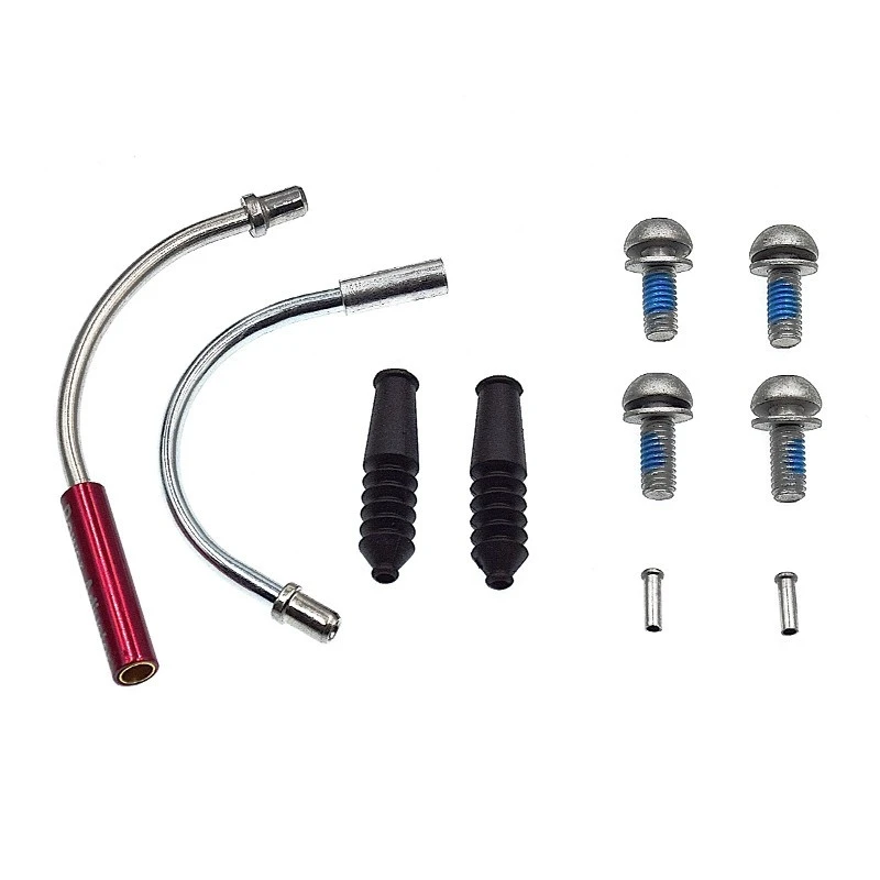 Paire de frein V-Brake avant et arrière pour vélo. L’ensemble complet comprend : Visserie, Gaine Teflon, 2 coudes, 2 embouts de câbles de frein, 2 câbles inox avec gaine et 2 étriers de freinage V-Brake en aluminium avec patins large en caoutchouc.