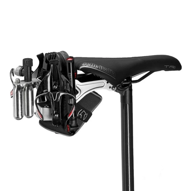 Ce support de porte-bidon ELITE Skekane spécialement conçu pour le triathlon vous permet d’installer deux porte-bidons à l’arrière de votre selle mais aussi de disposer de deux cartouches CO2 à porter de main.